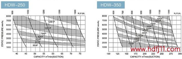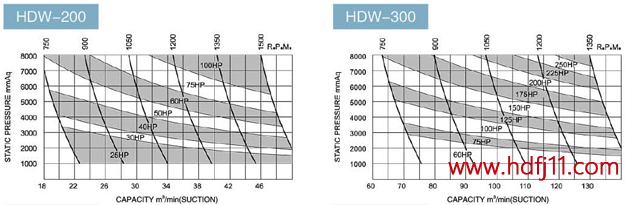 HDW-200至HDW-400負(fù)壓羅茨風(fēng)機(jī)性能曲線